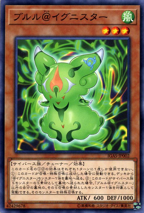(2):このカードがサイバース族SモンスターのS素材として墓地へ送られた場合、 「ブルル@イグニスター」以外の自分の墓地の、 そのS召喚の素材としたモンスター1体を対象として発動できる。