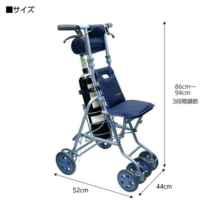 サイズ/ 折りたたみ時:幅44×奥行38×高さ90cm 使用可能ボンベサイズ:直径11.4×高さ50cmまで 材質/ 本体:アルミ(粉体塗装) タイヤ:EVA バッグ:ナイロン 最大使用者体重/ 80kg ボンベ受け耐荷重/ 3kgまで ●直径約14cmのボンベ受けがあり固定ベルトでしっかり止められます。