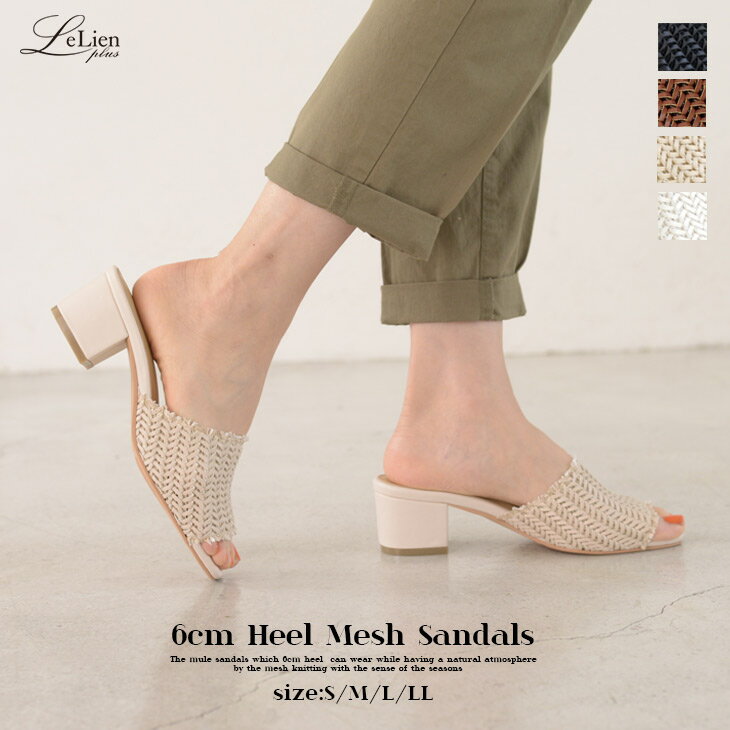 メッシュ編みサンダルミュール 6センチヒール レディース 春夏 ブラック ブラウン ベージュ ホワイト 22.0 24.5 スクエアトゥ 太ヒール リゾート ビーチ 履きやすい シンプル 柔らか 低反発 ルリアンプラス